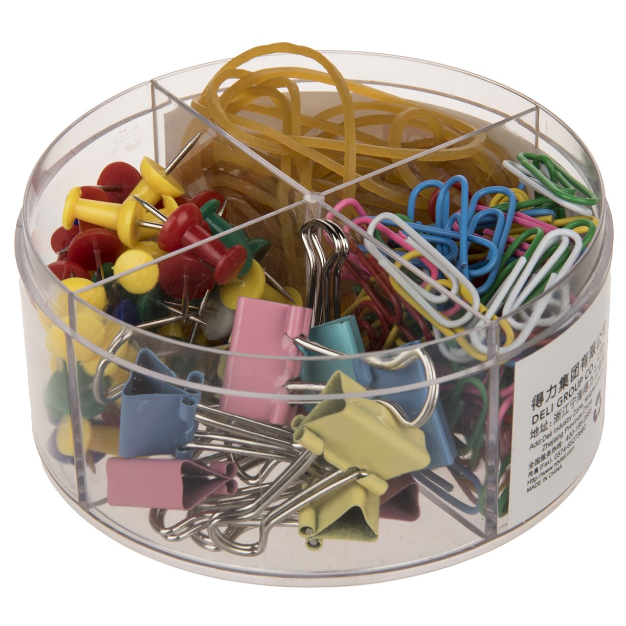 - مشخصات- محتوی: کش، گیره کاغذ کلیپسی، گیره کاغذ معمولی و سوزن نقشه